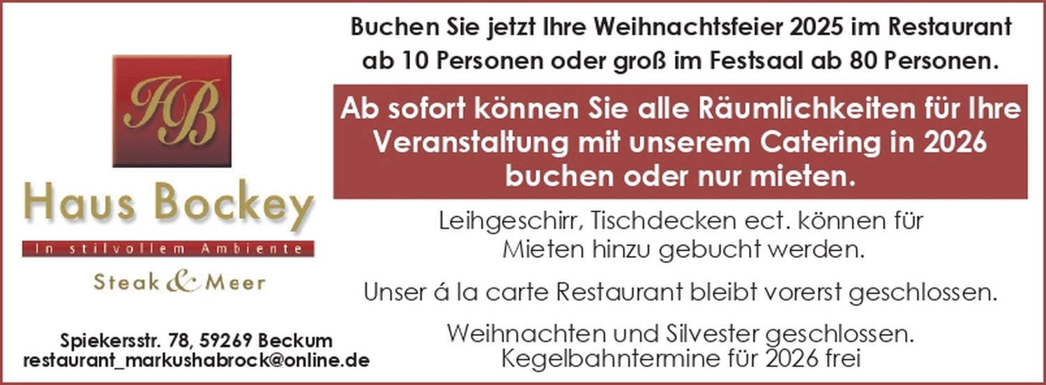 Das Traditionshaus “Bockey” mit Gastwirtschaft, Festsaal und Biergarten wurde 1922 als “Gastliches Haus mit Gast- und Landwirtschaft an der Spiekersstraße in Neubeckum von der Familie Caspar Bockey errichtet und betrieben. 1962 wurde die Gaststätte von Clärchen und Hermann Habrock sen. übernommen und 1964 durch einen Restaurantanbau und eine Kegelbahn erweitert. 1978 wurde die Karnevalsgesellschaft „Wir vom Schienenstrang“ im Haus Bockey gegründet. Hermann Habrock jun. und Irmgard Habrock führten das Lokal weiter. 1995 übernahm Markus Habrock, jüngster Sohn von Hermann und Irmgard Habrock, die Gaststätte. Der ehemalige Gaststättenbereich wurde im Frühjahr 2017 in ein schickes und modernes Abendrestaurant umgebaut und bietet heute 90 Sitzplätze.